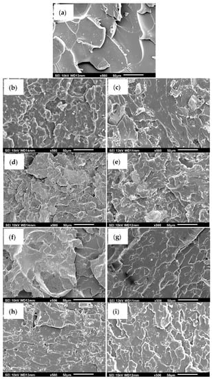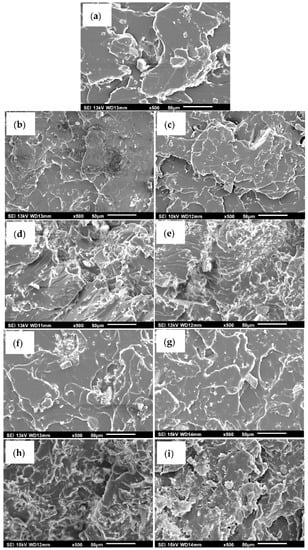 Figure 4 shows the tensile fractured surfaces of the unfilled bio-epoxy (Figure 4a), bio-epoxy containing 5 wt.% untreated eggshells (Figure 4b), bio-epoxy containing 5 wt.% eggshells treated with stearic acid (Figure 4c), bio-epoxy containing 20 wt.% untreated eggshells (Figure 4d), bio-epoxy containing 20 wt.% eggshells treated with stearic acid (Figure 4e), bio-epoxy containing 5 wt.% untreated limestone (Figure 4f), bio-epoxy containing 5 wt.% limestone treated with stearic acid (Figure 4g), bio-epoxy containing 20 wt.% untreated limestone (Figure 4h), and bio-epoxy containing 20 wt.% limestone treated with stearic acid (Figure 4i). The loadings of 5 and 20 wt.% were selected to view morphologies of the composites containing minimum and maximum filler contents. A similar approach was followed where SEM fractured surfaces were reported for only 10 and 30 wt.% for a study that added 0, 10, 20, 30, and 40 wt.% eggshell fillers in a polypropylene matrix [10]. The fractured surface of the unfilled bio-epoxy resin had smooth and cleavage features indicative of a brittle fracture. It also showed fewer uninterrupted crack paths after initiation compared to the composites. Similar fractured surfaces were observed with untreated and stearic acid treated composites. The micrographs of the fractured surfaces for composites containing 5 wt.% fillers (Figure 4b,c,f,g) showed a greater degree of roughness (white ridges), which may be due to more crack initiation and propagation sites as a result of filler additions. The degree of roughness further increased at 20 wt.% filler loadings (Figure 3h,i and Figure 4d,e). Overall, the differences in the tensile fractured surfaces suggest fillers played a role in changing the bio-polymer matrix.