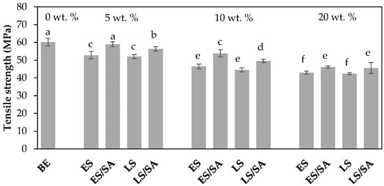 Tensile strength of unfilled bio-epoxy and bio-epoxy composites with loadings of 5–20 wt.%, where a,b,c… are the results from statistical ranking using Tukey’s method at 95% confidence level.
