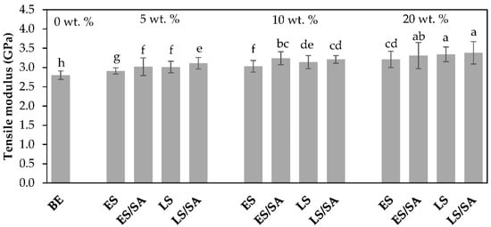 Tensile modulus of unfilled bio-epoxy (BE) and bio-epoxy composites with loadings of 5–20 wt.%, where a,b,c… are the results from statistical ranking using Tukey’s method at 95% confidence level.