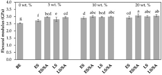 Flexural modulus of unfilled bio-epoxy and bio-epoxy composites with loadings of 5–20 wt.%, where a,b,c… are the results from statistical ranking using Tukey’s method at 95% confidence level.