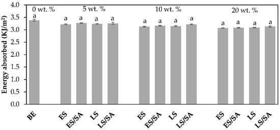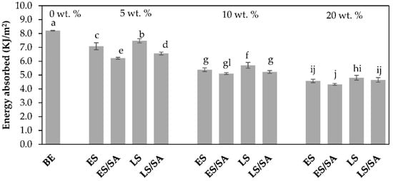 Effect of filler loadings on the Charpy impact energy absorbed by unfilled bio-epoxy and bio-epoxy composites with loadings of 5–20 wt.% at −40 °C, where a,b,c… are the results from statistical ranking using Tukey’s method at 95% confidence level.