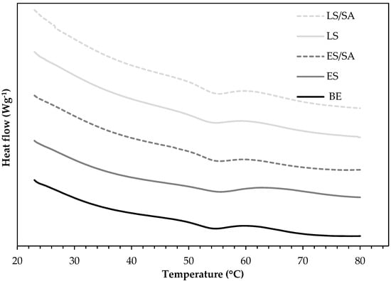 DSC thermographs showing the effect of 5 wt.% ES, LS, and SA-treated ES and LS fillers on the Tg of bio-epoxy composites.
