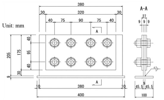 Figure 1 shows the shape and dimension of the experimental specimen in this study. A base plate with 205 mm × 380 mm was sandwiched between two cover plates with 175 mm × 320 mm. A steel plate with 400 mm × 100 mm was welded to the base plate for preventing the rollover of the specimen. The material of these plates was SS400, and they were 9 mm thick. The base plate and cover plates had 2 × 4 bolt holes with a diameter of 24.5 mm. High-strength bolts of F10T and M22 were inserted into the holes and tightened by the specified axial force [15]. The mechanical properties of the steel plate and the bolts are shown in Table 1. There were two manufacturing lots of the bolts because of a time lag of the procedure; however, there was a slight difference in the mechanical properties of these bolts. The number of specimens was two.