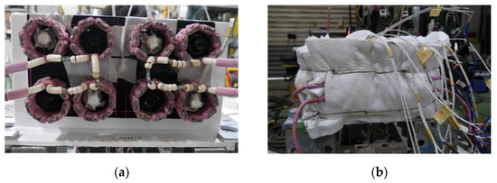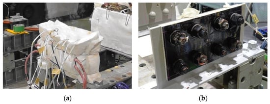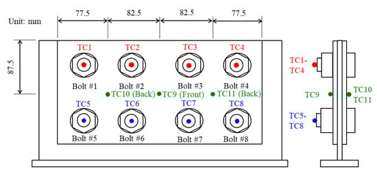 Figure 3a shows the heating device for the paint coating removal of bolted joints. The ceramic heater was assembled so that it surrounded each nut. The specimen and the heater were covered by thermal insulation material, as shown in Figure 3b. Figure 4 shows the positions of thermocouples. The thermocouples from TC1 to TC8 were attached to the tip of each bolt shaft. The thermocouples from TC9 to TC11 were attached to both surfaces of the cover plates. The thermocouple of TC3 was used for controlling the heat input and monitoring the temperature.