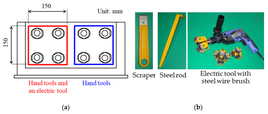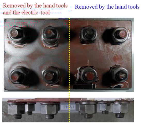After reaching the target temperature of 200 °C, the paint coating on the specimens was removed using hand tools such as a scraper and a steel rod. Figure 5a shows the areas of paint coating removal. The paint coating of the right sides of the specimen including four bolts was removed by using these hand tools. The time for paint coating removal work by the hand tools was 240 s. The paint coating of the left side of the specimen was removed by the hand tools as well as the right side by 240 s. After that, the paint coating of the left side of the specimen was removed by an electric brushing tool with steel wire. Figure 5b shows the tools of paint coating removal work. The electric wire brush was a general commercial product. The wire brush was connected to an electric hand drill with the power consumption of around 700 W. It was recommended that the rotation speed is adjusted to no more than 600 rpm when used for the paint coating removal. The brushing time was roughly 30 s per nut.