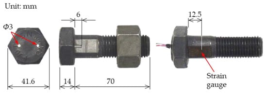For measuring the change in axial force during heating, strain gauges were attached to the surfaces of the bolt axes. Figure 6 shows the process of attaching the strain gauges. Two holes with a diameter of 3 mm were drilled into the bolt head. The lead wires of strain gauges were inserted into the holes. The strain gauges were attached to the position 12.5 mm away from the lower surface of the bolt head. Two strain gauges were attached on three bolts (#1, #3, and #6) per specimen.
