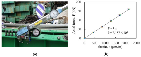The axial forces of the bolts were estimated by using a calibration coefficient previously obtained. The relationship between the axial force and the strain was obtained using five bolts. Figure 7a shows the appearance of the calibration experiment. Figure 7b shows the results of the calibration experiment. The slope of the relationship between the axial force and the strain corresponds to the calibration coefficient, which is 7.517 × 104. The change in axial force during the heating experiment was obtained by multiplying this coefficient to the measured strain value.