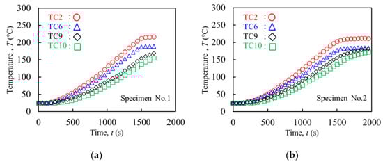 Figure 8 shows the temperature histories during the heating (Figure 8a: Specimen No.1, Figure 8b: Specimen No.2). Because the tendencies of temperature histories of similar positions (TC1 to TC4, TC5 to TC8, TC10 and TC11) were almost the same with each other, only the temperature histories of TC2 (the upper bolt), TC6 (the lower bolt), TC9 (the cover plate of heated side), and TC10 (the cover plate of not heated side) are shown as representatives.