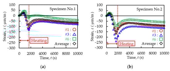 Figure 11 shows the behaviours of axial strains measured by three bolts in each specimen (Figure 11a: Specimen No.1, Figure 11b: Specimen No.2). In this experiment, the nuts were surrounded by the heater and heated. The thermal expansion of nuts elongated the bolts. Therefore, the strain increases in the bolts were observed at 750 s in Specimen No.1 and 450 s in Specimen No.2 from the start of heating. The maximum positive strains, on average, were 28.8 μm/m (standard deviation: 10.7 μm/m) in Specimen No.1 and 22.3 μm/m (standard deviation: 7.8 μm/m) in Specimen No.2. After that, the strain was reduced and changed to a negative value by the end of the heating. The minimum negative strains, on average, were −89.5 μm/m (standard deviation: 62.1 μm/m) in Specimen No.1 and −168.2 μm/m (standard deviation: 65.5 μm/m) in Specimen No.2. The high tensile axial forces originally were installed to the bolts. The additional expansions of bolts due to the heating of nuts might cause the yielding of the bolts in the former heating stage at 750 s in Specimen No.1 and 450 s in Specimen No.2. At that time, the temperatures of the bolt tips measured by the thermocouples TC2 and TC6 were around 80 °C in Specimen No.1 and 46 °C in Specimen No.2, respectively. The thermal strain, εT, of the steel material can be calculated by the following Equation (1).