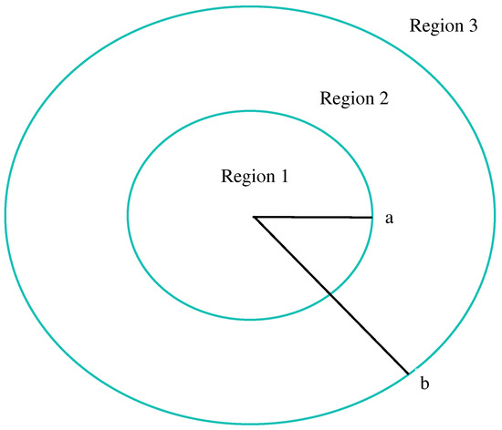 Consider a two-layer sphere embedded in an infinite uniform medium as shown in Figure 1, regions 1, 2, and 3, respectively, as the radial coordinate increases away from zero. The radius of the inner layer is a, and the outer layer is b (which can be scaled to unity), the center is at origin of the coordinate system, and the refractive index profile in region 2 is considered as a function of the radial coordinate r, defined by . Thus, in region 1, , the refractive index is a constant (). In region 2, , the refractive index is defined as where A and m are arbitrary constants. In region 3 (exterior to the sphere) , and the refractive index, can be any (complex) constant but here is taken to be one. The wave number is where is the wavelength of the external incoming electromagnetic plane waves. We consider the case that the sphere is nonmagnetic. The complex time-dependence of the electric field is assumed to be harmonic. As the derivation of equations is developed, many of acronyms and variables are provided in Appendix A in Table A1 to provide readability without flipping back and forth between pages.