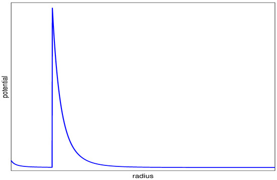 In this work, we consider the case that the inner layer has a constant refractive index , the outer layer has the variable refractive index , outside of the sphere has refractive index , and the angular momentum . The shape of the potential function is a single sharp peak as shown in Figure 2. The classically allowed region is the small area inside the sharp peak; outside the sharp peak is called the classical forbidden regions. The behavior of the resonance will occur in the classically allowed regions, then the wave function will continue decay monotonically in the forbidden or barrier regions. The wave function will finally vanish when r tends to infinity.