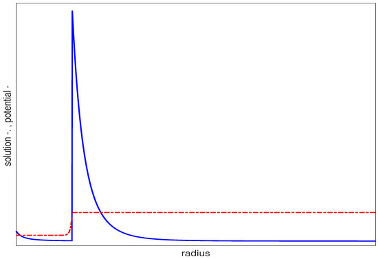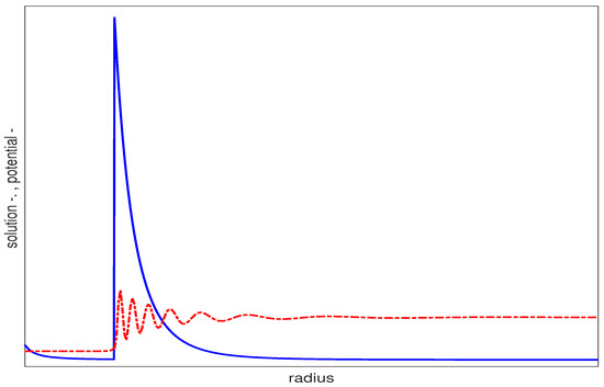 Radial wave functions for TM resonance with and . The inner radius is and the outer radius Note how effectively the mode is trapped close to the surface of the inner sphere. Red line (-.) represents the wave solution ; Blue line (-) represents the potential function .