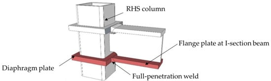 The specimens used in the experiments included an I-section beam connected to rectangular hollow section (RHS) column joints through a diaphragm, as shown in Figure 1.