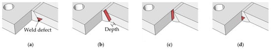 Locations and shapes of the defects: (a) flange surface crack (FSC), (b) flange through crack (FTC), (c) diaphragm through crack (DTC), and (d) diaphragm surface crack (DSC).