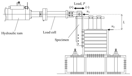 The tests were conducted at a ram head displacement rate of 0.05 mm/s. Cyclic loading comprised a few cycles in the elastic range. Subsequently, cantilever rotations of θp, 2θp, and 3θp with positive (tension) and negative (compression) displacement at each amplitude were conducted until failure. The full plastic moment Mp was calculated using the measured yield strengths of the materials. The rotations at the full plastic moment θp were calculated by dividing Mp by the elastic stiffness of the cantilever, which was determined using the slopes at the unloading portions of the hysteresis loops.