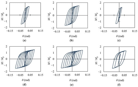 Hysteresis loops of the specimens: (a) FTC-8C, (b) FSC-7C, (c) FSC-14C, (d) DTC-8W, (e) DTC-12W, and (f) DSC-21W. The vertical axes of the loops are non-dimensionalized by dividing their values by Mp. (a–c): Reprinted with permission from Ref. [15]. Copyright 2016 Springer Nature.