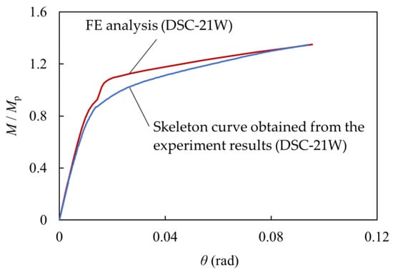 Figure 10 shows the comparison between the experimental and the analysis results. As the analysis was based on one-sided loading, the experimental results involved skeletal curves, with the history curve replaced by monotonic loading. The experimental and analytical results corresponded well. Therefore, the analysis captured the macroscopic behavior of the specimens during the experiments.