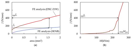 Failure moment prediction using TSM: (a) J-integral vs. area curves and (b) J-integral vs. moment curves.