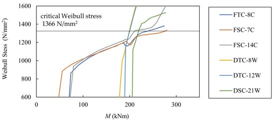 Figure 12 shows the relationship between the Weibull stress and the bending moment for each specimen. The calculated failure moment was achieved when the Weibull stress reached the limit determined through elastic–plastic analysis.