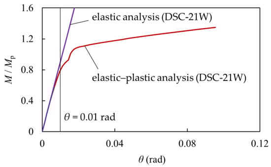 Figure 13 shows an example of the comparison between the elastic and the elastic–plastic analyses. Although we observed a gap between the results after yielding, the transitions of the elastic and elastic–plastic analyses appeared almost identical in the initial stage of the deformation. Therefore, the KI values and KII at θ = 0.01 rad, which were linearly correlated, were adopted to calculate RI.