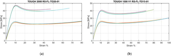 Furthermore, all these three resins increased the value of their breaking load and Young’s modulus. The green phase values for Tough 1500 and Tough 2000 are, respectively, 30.39 MPa and 26.46 MPa (tensile strength) and 435.08 MPa and 447.79 MPa (Young’s modulus). The cure parameters are the same for both resins (60 min at 60 °C). The curing process made both resins more resistant (breaking load increase 36% for Tough 1500 Resin and 59% for Tough 2000 Resin), also with greater yield strength, and stiffer, yet with different proportions (Young’s modulus increase +47% for Tough 1500 and +74% for Tough 2000).
