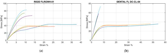 For the specific case of the Rigid Resin, the curing process made it more brittle (with the failure near the elastic limit), yet with a noticeably higher tensile strength value (an increase of 87%) and greater stiffness (Young’s modulus increase of 90%) which is suited well to the intended applications of this specific product. Moreover, in the case of the Dental LT Clear Resin, the loss of ductility was coupled with greater stiffness and a higher tensile strength value (+79%) necessary for the application purpose.