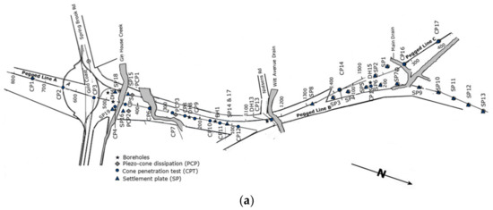 The site plan and the investigation locations and monitoring points are presented in Figure 2a. The NBR embankment’s longitudinal section is demonstrated in Figure 2b. It is worth noting that close to the Gin House Creek (see Figure 2), clay deposits involve a soft compressible clay layer with 8.4% organic contents. In the following sections, we discuss the geology of the NBR embankment.
