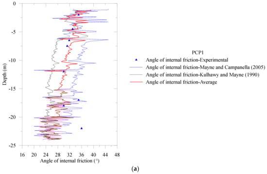 Two types of CPT interpretations for (see Equations (4) and (7)) are presented in Figure 8. For the NBR clay deposit, the Mayne and R.G. [29] method overpredicted the angle of internal friction, while Kulhawy and Mayne [29] underpredicted . However, it is found from Figure 8 that the average of these two methods (see Equations (4) and (7)) is nearly identical to the experimentally measured angle of internal friction.