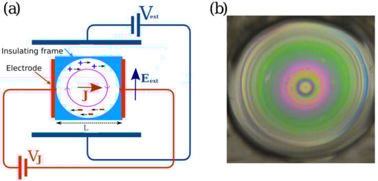 We used the same experimental setup as suggested by Amjadi et al. for producing controllable rotation in a freely suspended liquid film [,]. A schematic of the experimental setup is shown in Figure 1a. The liquid film rotates when an electric current passes through the liquid film and, simultaneously, an external electric field is applied in the direction perpendicular to the current. For producing the liquid film, an electrically insulating frame is used (Figure 1). We used an insulating frame made of phenolic resin with a relative permittivity of 8. By drawing a wet pad containing the liquid over the frame, a freely suspended liquid film is produced on the frame aperture. Two thin electrodes are coated on the frame on opposite sides of the aperture to conduct the current, and the fluid film is in direct contact with the electrodes. By applying an electric voltage between the electrodes, a very small electric current of about 1 A is established in the film []. The frame is located between the two plates of a large capacitor in order to apply an external electric field (), initially parallel to the plane of the film and perpendicular to the electric current passing through the liquid film. When the external electric field is applied to the liquid film carrying the electric current, the film will rotate in the direction of . The experiments are performed at room temperature of 25 degrees Celsius.