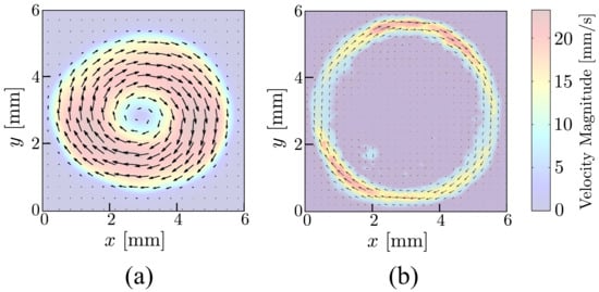 (a) Results of PIV analysis for a water film with relative permittivity of 81, rotating under kV/cm and V. The rotational flow has its maximum somewhere in between the center and the edges. (b) PIV analysis of a liquid film with low relative permittivity. A film of nonyl chloride with relative permittivity 4.1 is rotating under kV/cm and V. The rotation is localized near the edges.