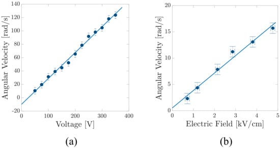 Previous research on liquid film motors was mostly limited to water and water solutions with very high permittivity [,,]. Permittivity represents the tendency of the molecular charges to distort in the presence of an electric field. It is a constant of proportionality that connects the electric field to the electric displacement in a material. Therefore, it is expected that permittivity should affect the dynamics of induced movement by external electric fields in a liquid. Surprisingly, so far it is assumed that the fluid rotation in a liquid film motor is only controlled by the conductivity of the liquid and the strength of external electric fields and currents. Therefore, the effect of the permittivity of the liquid on the rotation profile has been completely neglected in all previous studies.