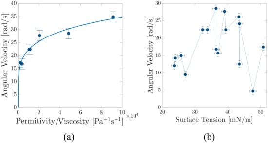 (a) Angular velocity versus relative permittivity per viscosity of different liquid films rotation under constant and . Angular velocity changes with the relative permittivity per viscosity in a power-law manner with an exponent of . (b) Angular velocity as a function of surface tension for different liquids. The experiments are performed at V in a constant external electric field of kV/cm.