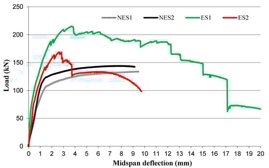 | Beam NES2 | 143.8 kN | Tensile rupture of a longitudinal rebar | 9.16 mm |