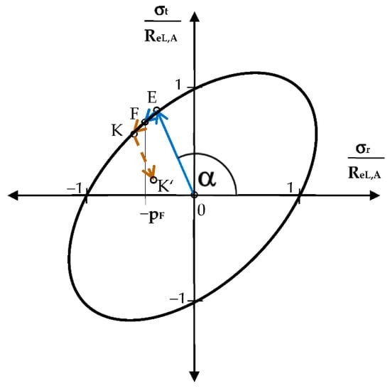 There are a number of publications on this subject, in which the loss of joint pressure after the plastic load of interference fits during operation has been investigated in more detail [,,]. To illustrate these relationships, please refer to the representation of stress states in Figure 1. Here, the ideal plastic stress changes at the inner diameter of an outer part (hub) under internal pressure are shown in the principal stress plane, assuming the plane stress state (ESZ). Their axes are formed by the radial stress on the abscissa and the tangential stresses on the ordinate. The ellipse represents the ideal plastic yield strength according to Equations (2) and (3) (Section 3.2).