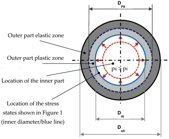 In previous practice, elastically–plastically designed interference fits with a joint pressure of pF (identical to the negative radial stress pF = −σr) are produced during the joining process, as shown in Figure 1, along the load path (blue arrow/solid line).