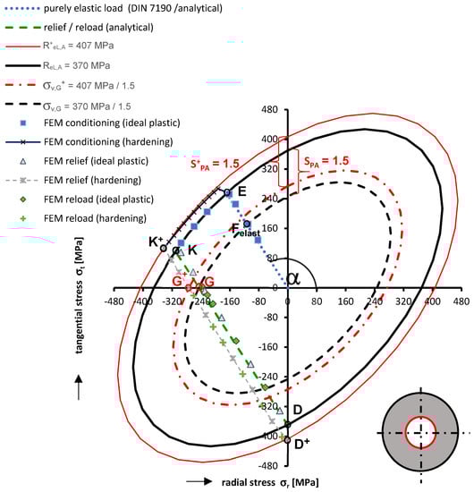 This consideration is then inevitably followed by a new equivalent limit stress σ+v,lim for the predetermined safety against plastic deformation of SPA = 1.5 with σ+v,lim = 274 MPa (represented by the red line-point ellipse in Figure 3). Their point of intersection with the load straight line indicates point G+ for the desired stress state, with pE,Kond = 274 MPa. The identity of the aforementioned equivalent limit stress shows that the tangential stresses disappear here.