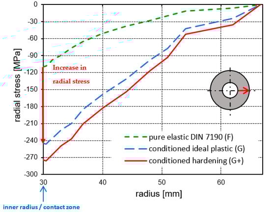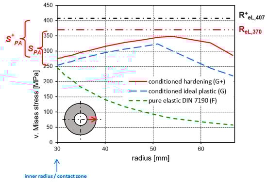 With σv = 274 MPa, the equivalent stress at point G+ (Figure 4) is greater than that for the ideal plastic material (σv = 253 MPa at point G), where the yield strength R+eL,A (black line-point line in Figure 4) has also increased as a result of the material strain hardening. The identity of the safety against the plastic deformation of SPA = 1.5 = S+PA (S+PA → after hardening of the material) was a prerequisite for the comparability of the investigated modes and a central point of the task (see Section 3.2). However, for the sake of clarity, the safety shown in Figure 3 and Figure 4 was symbolized as differences between ReL,A and σv,lim or R+eL,A and σ+v,lim. Therefore, SPA at this point appears to be lower than S+PA due to the smaller amounts of ReL,A and σv,lim. The values for radial stress are shown in Figure 5 (represented by the red line), which illustrates their additional reinforcement compared with the ideal plastic material (represented by the blue dashed line).