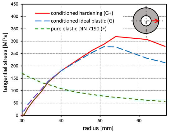 The low tangential stresses of the inner diameter of the conditioned hub (point G in Figure 6) correspond to those in Figure 3 and illustrate the residual stresses caused by plastic conditioning. In contrast, the tangential stress at point Felast of the inner diameter of the hub is σt = 171 MPa.