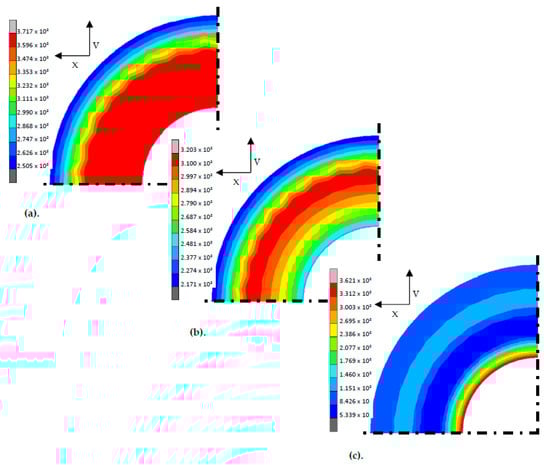 The deviations of the lines of identical stress from the circular shape in the outer area of the hub were due to numerical divergences caused by the shape of their meshing. However, according to the principle identified by Saint-Venant, these divergences diminish with increasing distance from the point of origin, so that in the area of the inner diameter of the hub to be investigated, due to sufficiently fine meshing, very good agreement can be seen in the results of the numerical calculations with the analytical results shown in Figure 3.