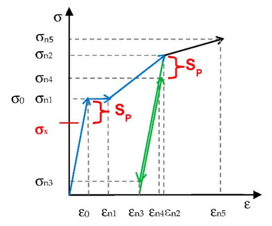 During the plastic stress (e.g., conditioning) of a hardening material, its yield strength is increased from σ0 to σn2 (Figure 8). After a subsequent purely elastic relief to σn3 in Figure 8, renewed reloads between σn3 and σn2 were also purely elastic. New plastic stresses only occurred when the previous stress level σn2 was exceeded. Thus, at point σn4, the same safety against plastic stress SP was achieved as with the stress state σX (without conditioning), but at a significantly higher stress level.