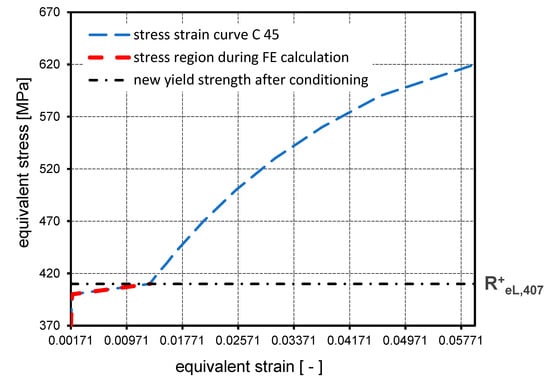 The path for the change of the respective stress states during the load increase is represented in Figure 3 by the black -x-x-x-x- line. The gradient of the stress change in the respective load step is mainly defined by the stress-strain curve (represented by the blue dashed line in Figure 9), which is determined by the values found in Table 3. The stress range applied during the FE calculation is represented on the stress–strain curve with a red dashed line.