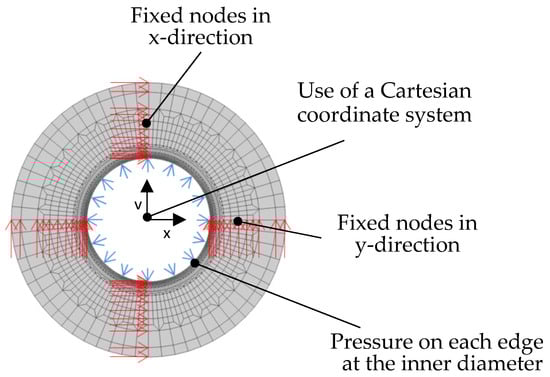 Furthermore, Scheme 1 shows the meshing of the FE model, as well as the boundary conditions and loads used. Based on a Cartesian coordinate system, all nodes were fixed along the abscissa in the y-direction and along the ordinate in the x-direction (red arrows in Scheme 1).