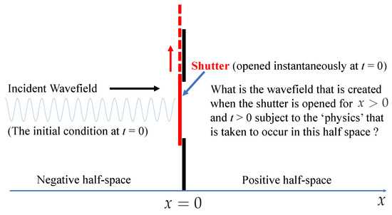 Schematic diagram of the shutter problem for which the following question is relevant: What is the wave-field generated in the positive half-space when the shutter is opened instantaneously at , subject to the ‘physics’ (quantified by the partial differential equation which defines the physical model) that is taken to occur?