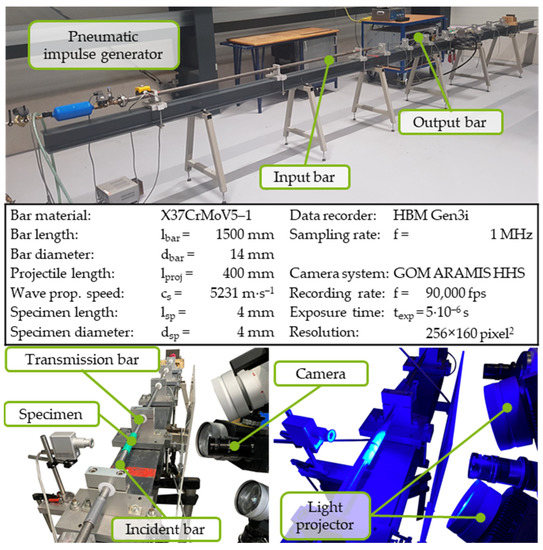 Challenges regarding the application of high-speed cameras with subsequent DIC analysis in SHPB occur due to the high testing speeds, and thus the high strain rates, which emerge during those tests. The nominal strain rate during SHPB tests with standardized specimen geometries is usually about 2000 s−1, meaning a minimum recording rate of 10,000 Hz is necessary to receive at least one picture within the test time.