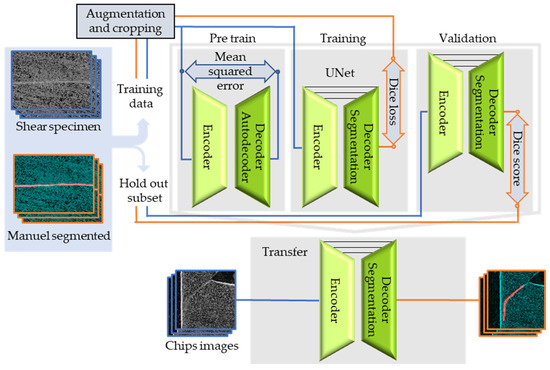 Since the formation of cracks and shear bands in high-strength materials is known to be a challenge in the evaluation of SHPB tests, and since these are additionally deliberately induced when shear specimens are used, a deep learning approach was developed to accompany the investigations, which allowed for the automated detection and quantification of shear bands. For this purpose, each pixel in the microscopy images was classified and divided into areas with shear bands and without shear bands. This image segmentation was carried out by a neuronal network, which learns the specific pattern of shear bands. In this study, unsupervised pre-training was performed using an autoencoder. This type of machine learning model reproduces its input by compressing it into a low-resolution latent space. A decoder reconstructs the data in the latent space representation to the original input. The reconstruction is compared with the input data by the mean squared error. The weights of the encoder and decoder are adapted until the optimum reconstruction is achieved by backpropagation. Due to the low degrees of freedom in the latent space, the encoder selects the most imported feature for the reconstruction and therefore learns an efficient encoding of the data. By transversal learning, the pre-trained weight of the encoder is used for segmentation as the initial network weight. This reduces the duration of convergence while training, and can boost the network’s accuracy [22]. To prove the transferability to chip formation, the segmentation network is also applied to segmented shear bands of chips. An overview of the procedure is shown in Figure 2.