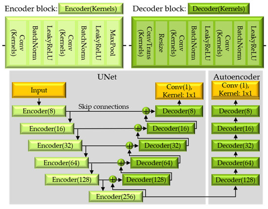 Structure of the autoencoder and UNet.