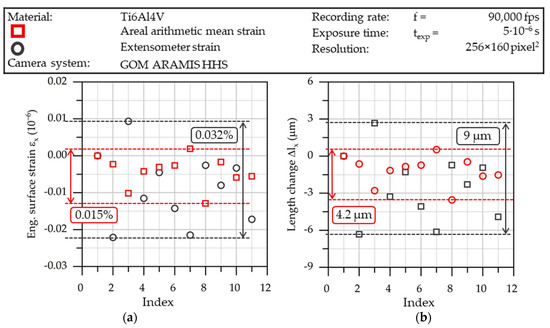 In order to define the camera system’s accuracy, eleven recordings were taken of the specimen in an undeformed initial state. The subsequent DIC analysis was evaluated regarding the maximum deviation in the engineering surface strain εx and length change Δlx. The evaluation was conducted on the one hand by using the arithmetic mean strain of the entire visible specimen’s surface, and, on the other hand, by means of a digital extensometer, which was positioned in the center of the specimen (Figure 6). In order to establish a testing strategy under authentic and application-oriented conditions, the measurement was carried out with the optimized parameters as described above.