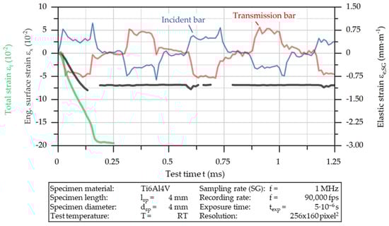 However, there is a limitation: the strain gauges record an increase in strain over a longer period than DIC. This results in a maximum value of εt ≈ −22%, while DIC calculates εx ≈ −18.5%. This can be attributed to the hysteresis effects that occur in highly dynamic material testing [6]. Mates et al. found that the deformation rate in SHPB tests of AISI 1045 measured by strain gauges increases up to a strain of εt ≈ 5.5% and then stabilizes [30]. The same behavior can be seen from the green curve in Figure 9, which has a changing gradient until a strain of εt ≈ −4%. In the case of the DIC measurements, this effect does not occur and the strain is linear from the beginning, which aligns with the theoretical assumption.