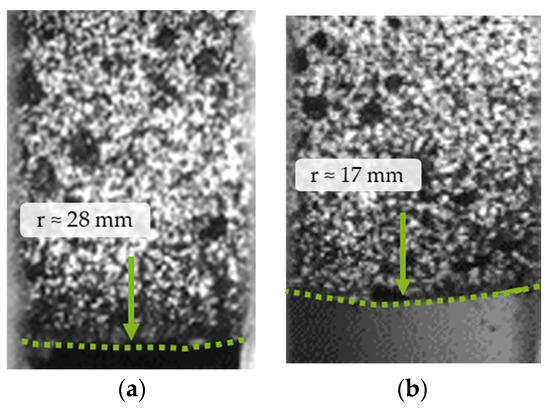 Bulging at the circumference of the specimen, which was observed in particular for Ti6Al4V alloy, was identified as the main mechanism of the inhomogeneous specimen deformation as well as the main reason for non-compliant measurements between the two methods. Figure 12 compares the bulging of AISI 1045 and Ti6Al4V based on the radii formed. While the radius for AISI 1045 steel is of insignificant magnitude (r = 28 mm) compared to the ideal conditions of an infinite radius, for Ti6Al4V alloy it is r = 17 mm and therefore significantly more bulged. Typically, this bulging is attributed to the friction between the bars of the SHPB and the specimens [9]. However, in this case, Ti6Al4V is assumed to have comparable or even reduced friction compared to AISI 1045 steel. This behavior is assumed to be more non-uniform compared to AISI 1045 steel, as is clearly observable by comparing Figure 9 and Figure 11. It is deduced that, for corresponding materials, alternative methods for the data evaluation of flow stress and damage characterization at SHPB have to be developed.