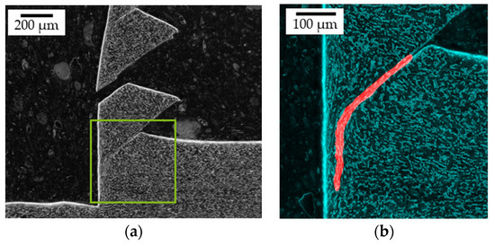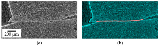 In the following section, the results of the deep learning approach for the characterization of shear bands in the Ti6Al4V-specimen are presented. Despite the limited amount of training data, the network achieves a total dice score of 0.81, with the worst performance from the five-fold-cross validation being 0.77. An example segmentation result from the test data is shown in Figure 13. In addition to this high performance, given the limited amount of training data, the model was also tested on chips to demonstrate its ability to detect shear surfaces. Although no chip images were used in the training process, the network was able transfers the structures’ features and detect deformed surfaces in the chips (Figure 14). However, full detection of the sheared surface is still not possible, due to the small amount of training data. Nevertheless, the model’s strong generalization capabilities show its good suitability for further analysis of kinetically similar material deformation. Therefore, deep learning could be used for the transverse analysis of shear specimens in a more general analysis of chips.